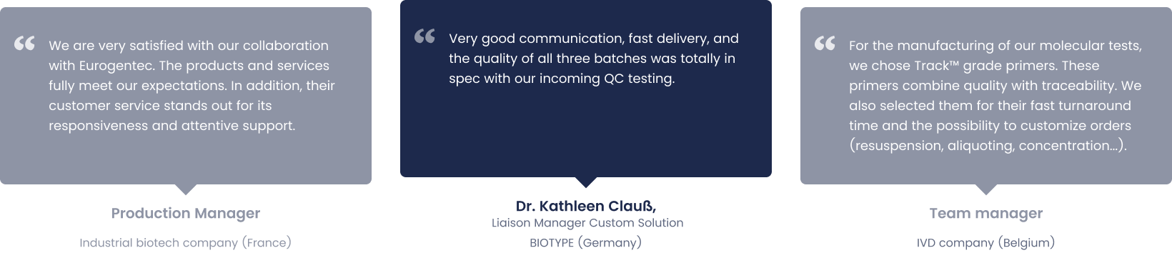 With over 40 years of oligo manufacturing expertise, Eurogentec supports diagnostic and testing professionals at every stage — from routine in-house assays to regulated kit production. We deliver high-quality, customizable oligos across all synthesis grades — tailored to your technique, application, and compliance needs.