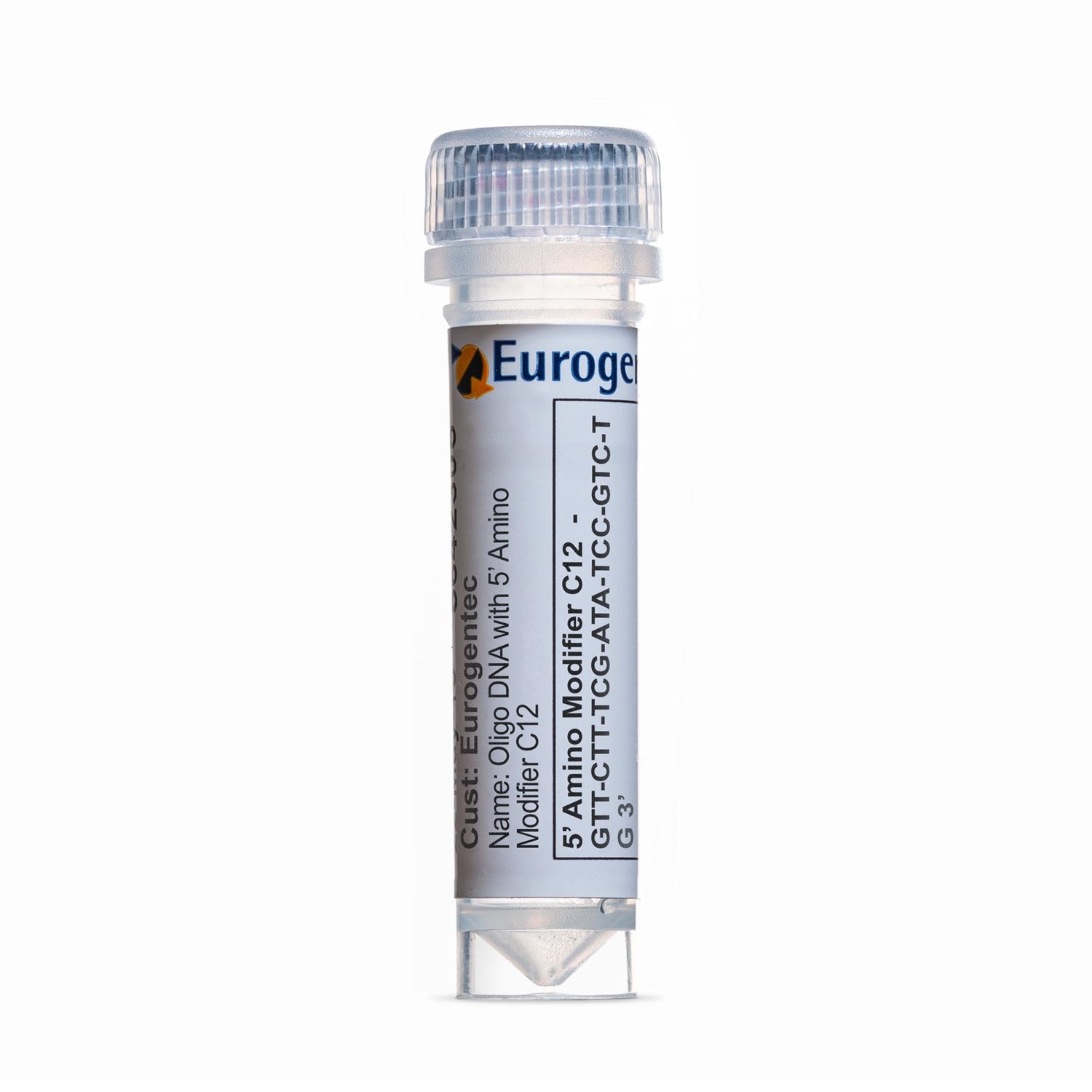 The introduction of a primary Amine (NH2) at the 5’-position is used to functionalize the corresponding terminus of the nucleotide for conjugation with e.g. an activated NHS ester or isothiocyanate fluorescent label. Several spacers are available (C3; C6 and C12), all of them are hydrophobic. The available lengths of the spacers are 3, 6, or 12 methylene (CH2) groups between the terminal phosphate and the amino “moiety”.