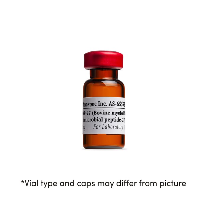Bovine myeloid antimicrobial peptide-27 (BMAP-27) belongs to the cathelicidin family of peptides which displays rapid bactericidal activity against Staphylococcus aureus, Streptococcus uberis, and Escherichia coli1. Cathelicidins belong to the large group of cationic peptides with amphipathic properties and have critical role in mammalian innate immune system. BMAP-27 is cytotoxic to human erythrocytes and neutrophils, although at higher than microbicidal concentrations. It has a potential for the treatment of bacterial infections in individuals with cystic fibrosisassociated lung infections.