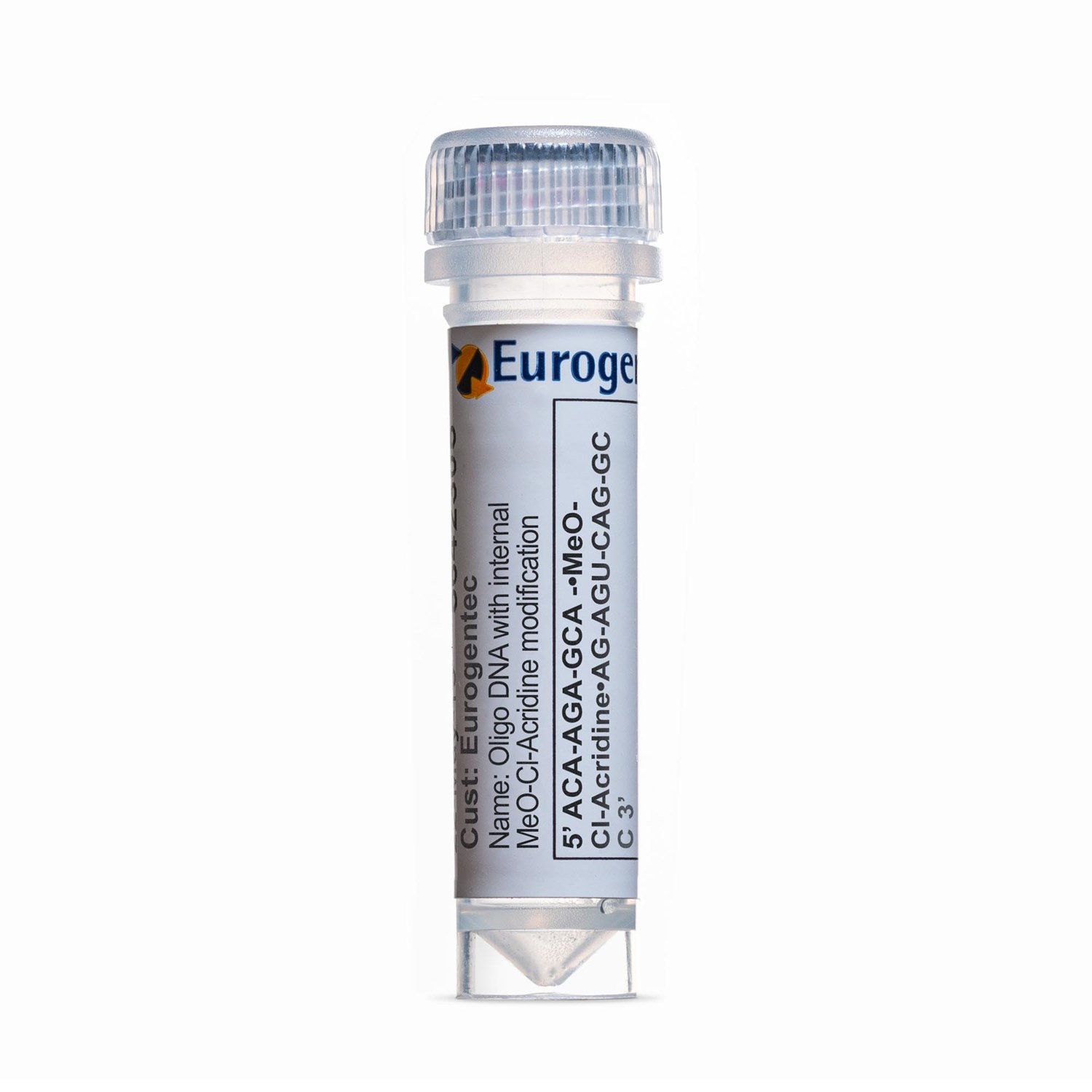 Oligos bearing the 6-chloro-2-methoxyacridine molecule at either terminus or within their sequence have the ability to intercalate efficiently into a double helix. Covalent binding of MeO-Cl-Acridine therefore increases hybrid stability by providing additional binding energy. Acridine-labelled oligos can thus be used in applications where increased stability of oligonucleotide hybrids is crucial. Adding the dye to the 3’terminus also protects the oligo from exonuclease degradation.