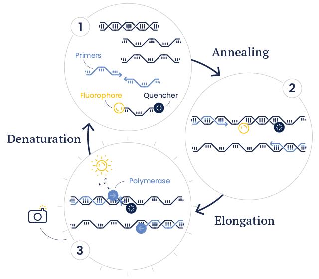 During the amplification process, the 5’>3’ exonuclease activity of the Taq DNA polymerase cleaves the fluorophore from the probe. Since the fluorophore is no longer subjected to FRET quenching, it starts to fluoresce. This fluorescence can be measured, and the level is directly proportional to the amount of target DNA accumulating during the PCR reaction.