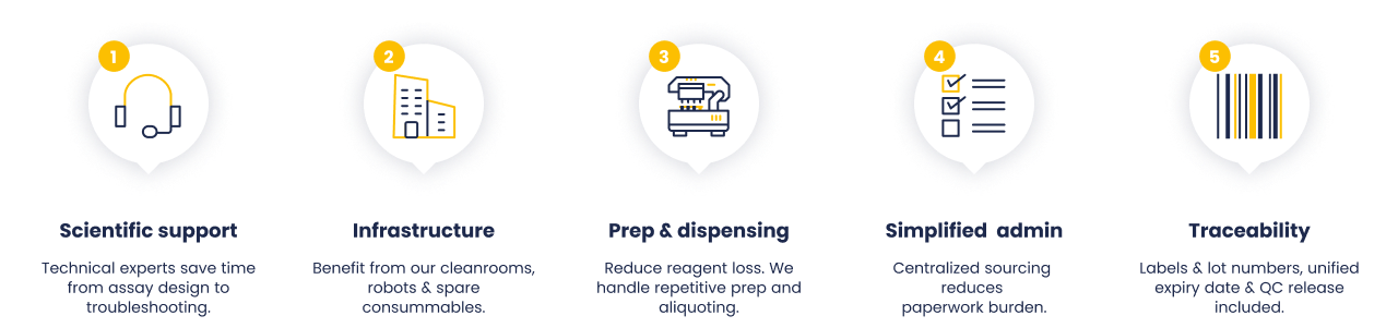From oligos to enzymes and plastics, all essential core reagents are produced, premixed, and formatted by a single trusted partner.
