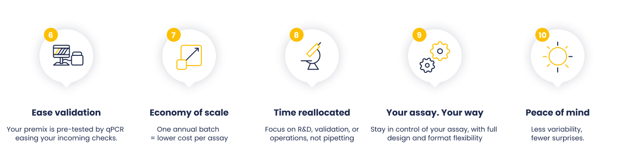 Routine testing demands speed and reliability. However, pipetting individual reagents and dispensing qPCR premixes is repetitive and error-prone. De-risk your workflow by outsourcing assay preparation at scale in a ready-to-use format. Focus your resources where they matter most.