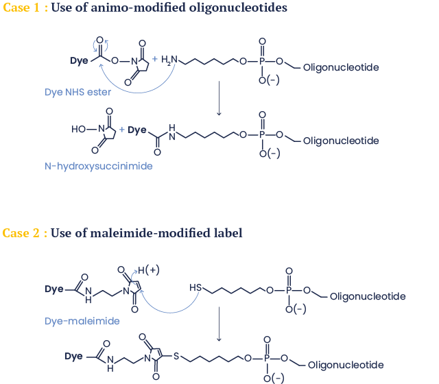 In the first case the label is conjugated to an amino-modified oligonucleotide (3’, 5’ or on a dT) using its amino-reactive version (N-hydroxysuccinimide (NHS) ester in most cases).