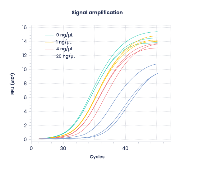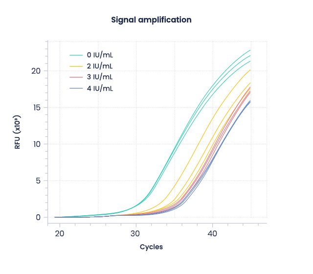 Fig 4 . Amplification curves of the Parainfluenza4 gene within a duplex RT-qPCR assay by Takyon® Ultra in presence of growing heparin concentration . Each reaction was conducted in triplicate.
