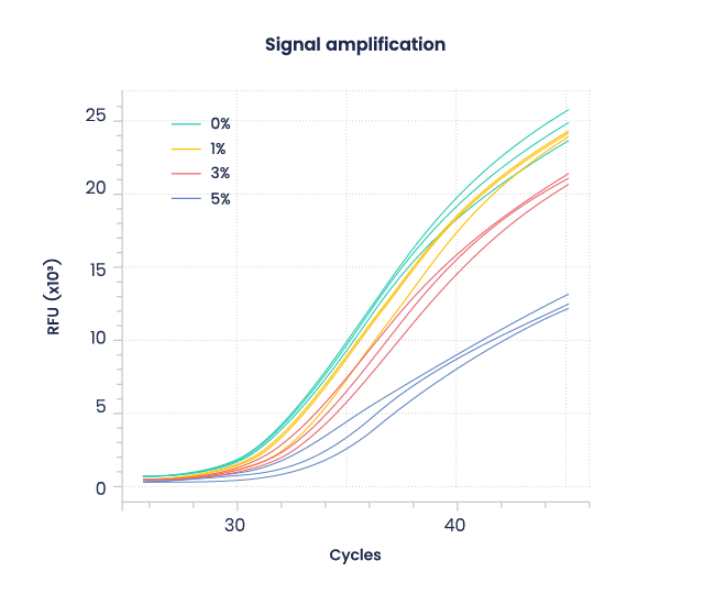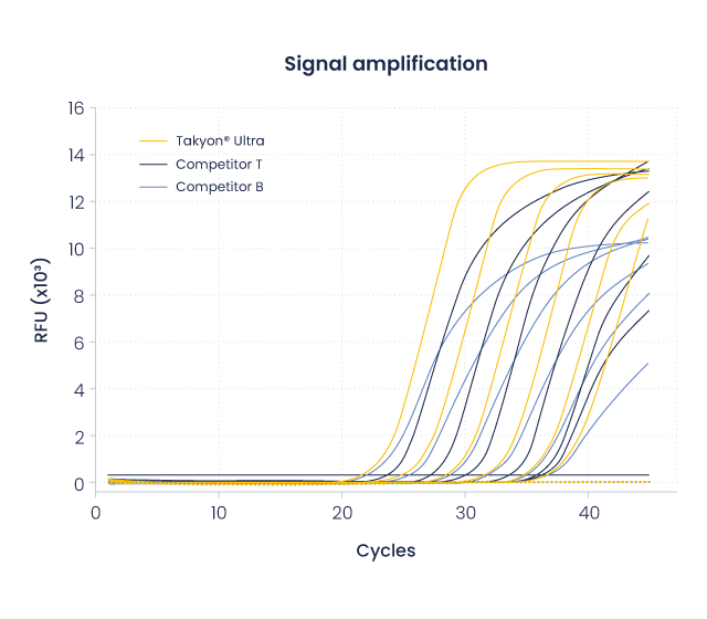 Our Master Mix formulation delivers clean non template controls (NTCs) and enhanced specificity, even in low copy viral target contexts, ensuring both reliable negative results and high detection sensitivity. In addition, Takyon® Ultra offers enhanced multiplexing capabilities, enabling the simultaneous detection of multiple targets with confidence.