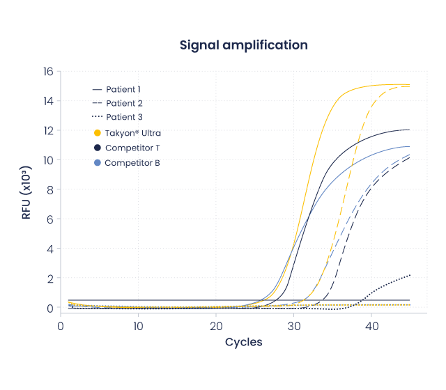 To demonstrate its suitability for RNA applications, Takyon® Ultra RT-qPCR was tested in a triplex