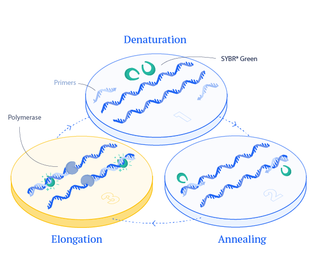 SYBR® green is an intercalating dye used in qPCR assays. SYBR® green fluoresces only when bound to double-stranded DNA (dsDNA).