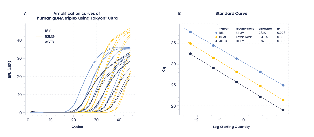 Fig 1. a) Amplification curves of human genomic DNA targets ACTB, 18S, and B2MG in a triplex qPCR reaction using Takyon® Ultra. Serial dilutions of gDNA were tested, ranging from 50 ng to 5 pg. Each condition was performed in technical triplicates.